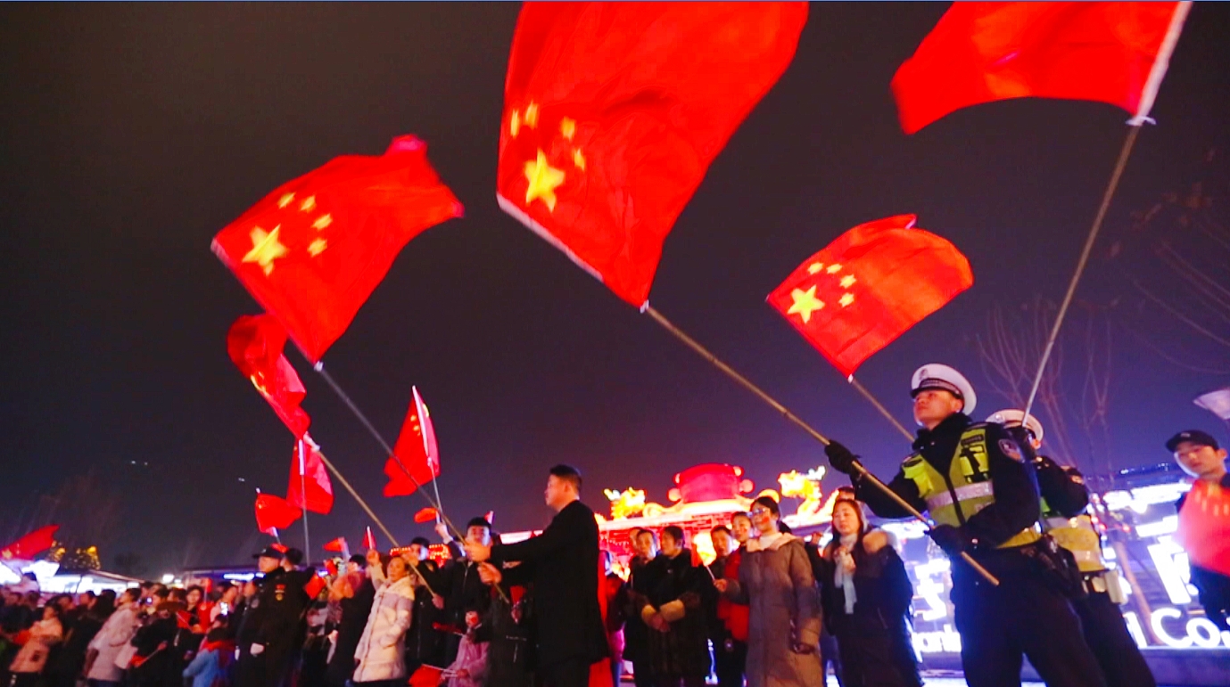 1月31日晚20:00,熊貓燈會(huì)華燈璀璨,人流熙熙攘攘?!拔逍羌t旗迎風(fēng)飄揚(yáng),勝利歌聲多么嘹亮……”清脆的童聲突然響徹夜空,讓所有人停下了腳步。音樂漸漸響起,人群中響起了唱合的聲音。越來越多的人走了出來,他們身上佩戴著紅色的圍巾,臉上畫著五星紅旗,手中拿著五星紅旗,一邊歌唱,一邊走向燈會(huì)的中心廣場。一百多名快閃表演者在中心廣場最具中國傳統(tǒng)特色的“盛世宮燈”前匯聚成矩陣,二十多只大熊貓胖墩兒也手持五星紅旗加入其中?!拔覑勰阒袊膼鄣哪赣H,我為你流淚,也為你自豪……”載歌載舞的快閃表演,很快把園內(nèi)的觀燈群眾吸引了過來,隨著歌曲的高潮,全場五星紅旗都揮舞起來,人們高舉雙手,打著拍子,一起唱和,激情澎湃。