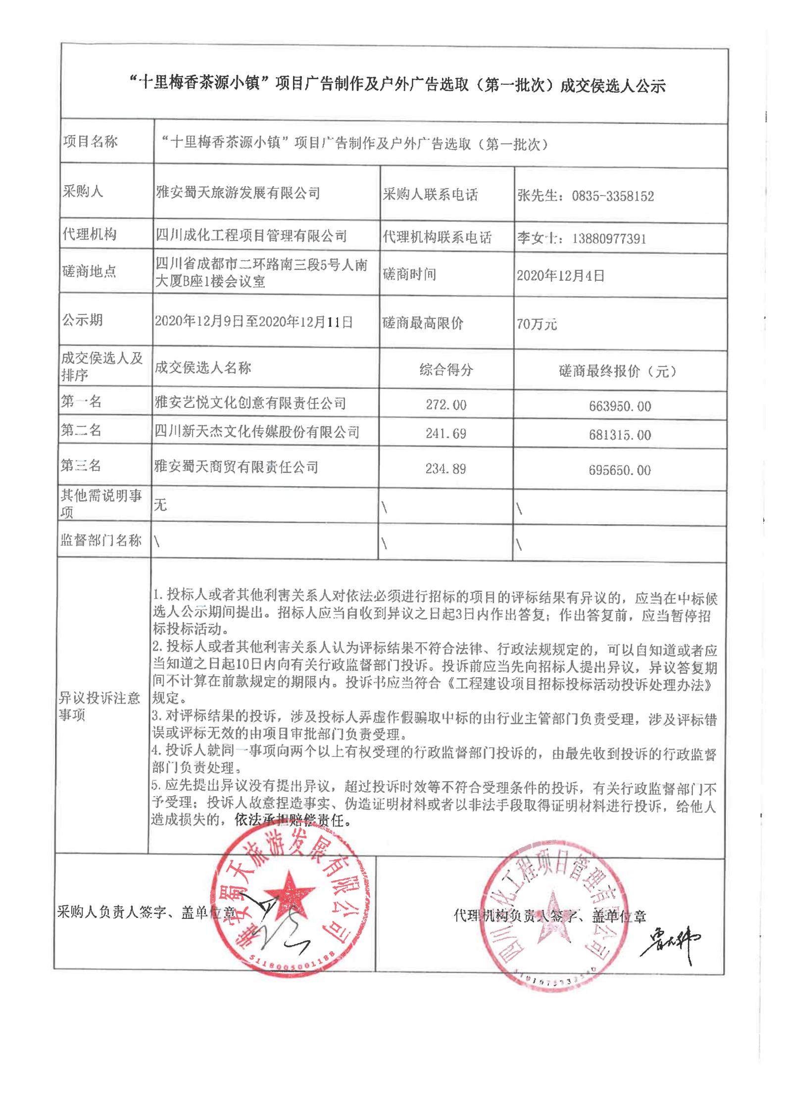 "十里梅香茶源小鎮(zhèn)"項目廣告制作及戶外廣告選取(第一批次)成交侯選人公示