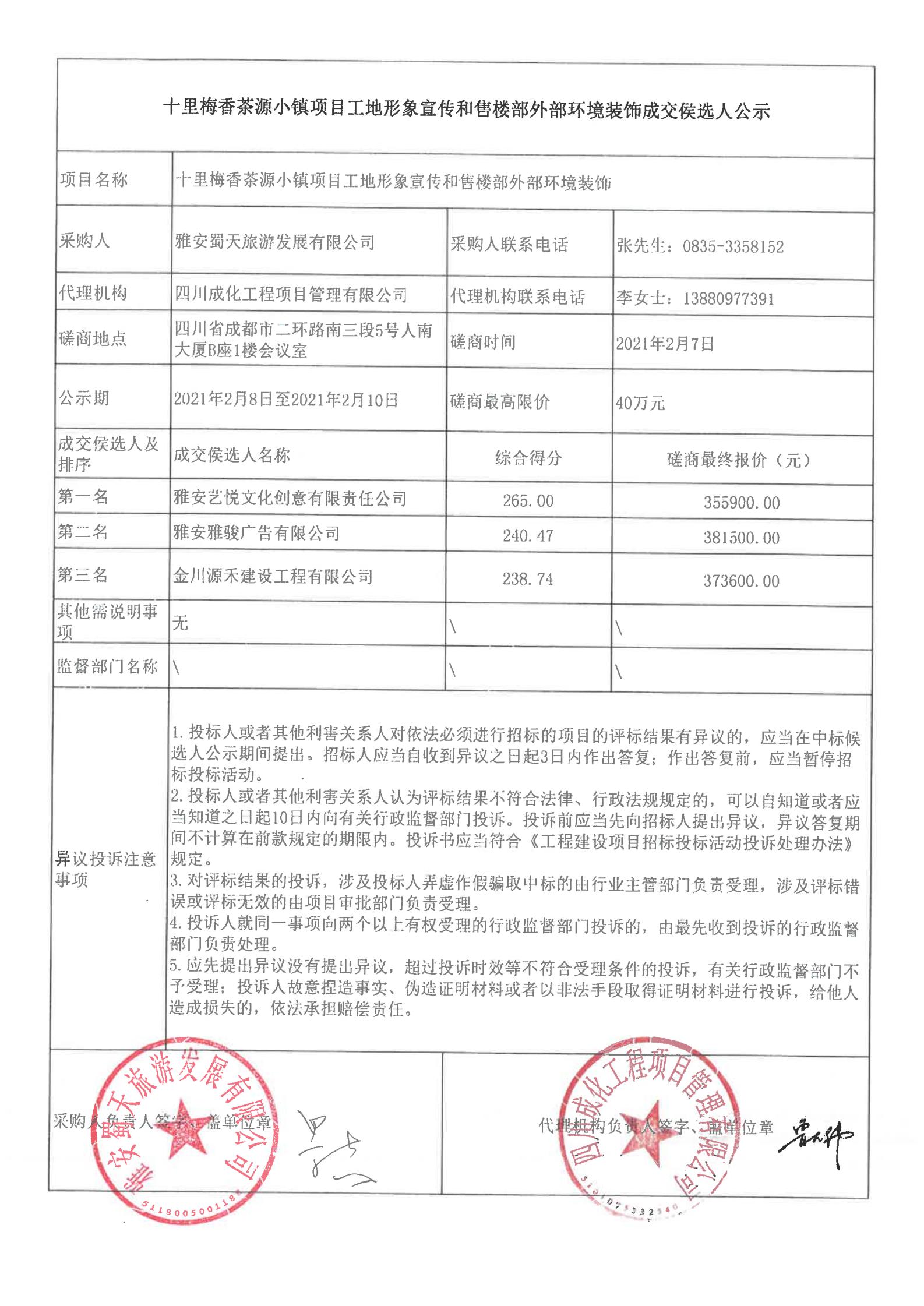 十里梅香茶源小鎮(zhèn)項(xiàng)目工地形象宣傳和售樓部外部環(huán)境裝飾成交侯選人公示