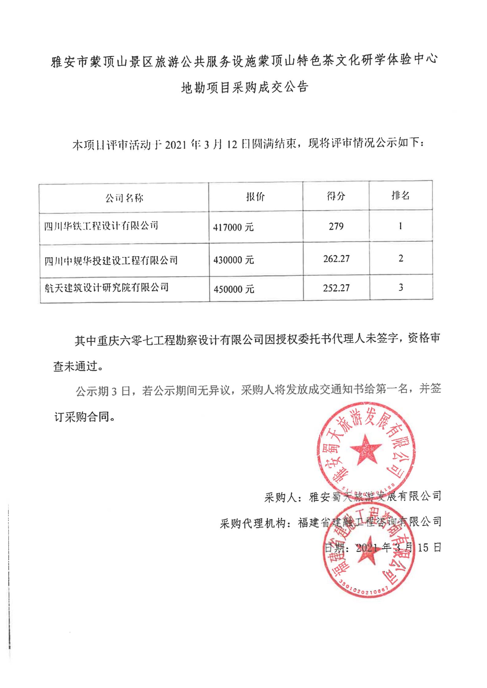 雅安市蒙頂山景區(qū)旅游公共服務(wù)設(shè)施蒙頂山特色茶文化研學(xué)體驗(yàn)中心地勘項(xiàng)目采購(gòu)成交公告