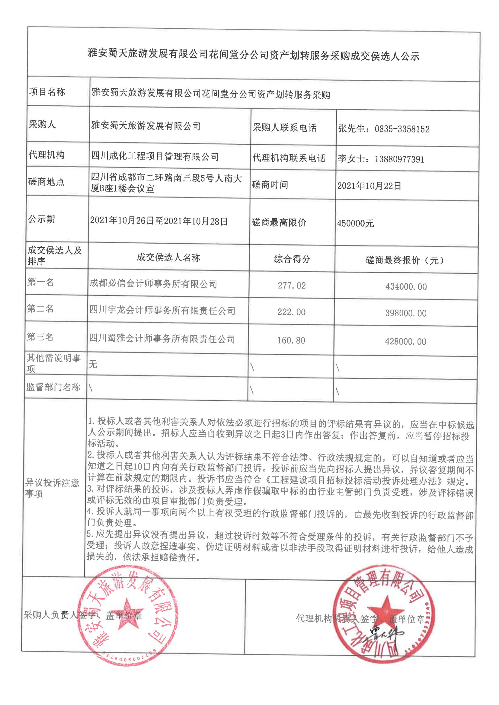 雅安蜀天旅游發(fā)展有限公司花間堂分公司資產(chǎn)劃轉(zhuǎn)服務(wù)采購(gòu)成交候選人公示