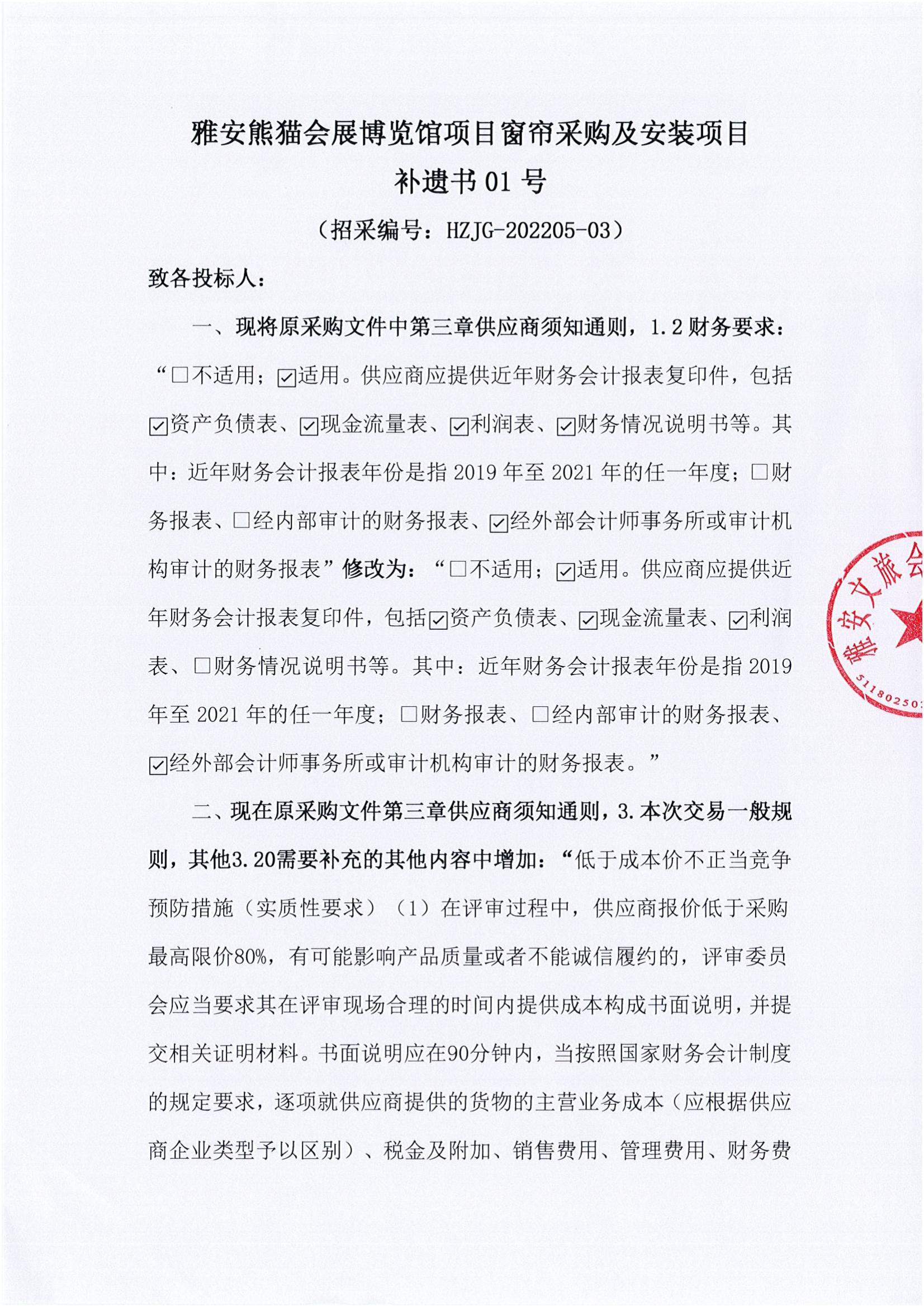 雅安熊貓會展博覽館項(xiàng)目窗簾采購補(bǔ)遺書01號
