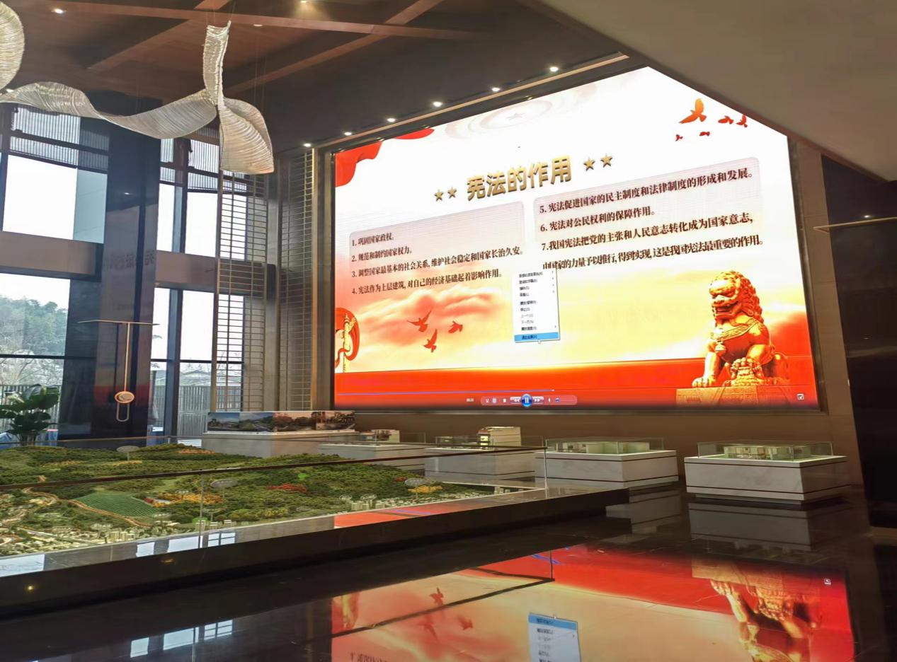 三是定點投放憲法宣傳標(biāo)語。為加強(qiáng)憲法宣傳,提高公民的法律意識,同時起到時刻提醒公民關(guān)注憲法、了解憲法的作用,雅安文旅集團(tuán)通過酒店大屏、建設(shè)工地、房產(chǎn)銷售中心等多處電子宣傳屏投放憲法宣傳標(biāo)語,以此營造良好的憲法宣傳氛圍,增強(qiáng)了憲法學(xué)習(xí)宣傳聲勢,形成了規(guī)模效應(yīng)。
