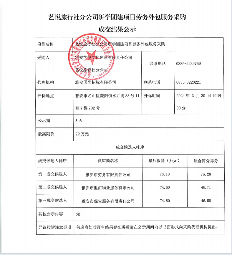 藝悅旅行社分公司研學(xué)團建項目勞務(wù)外包服務(wù)采購成交結(jié)果公示