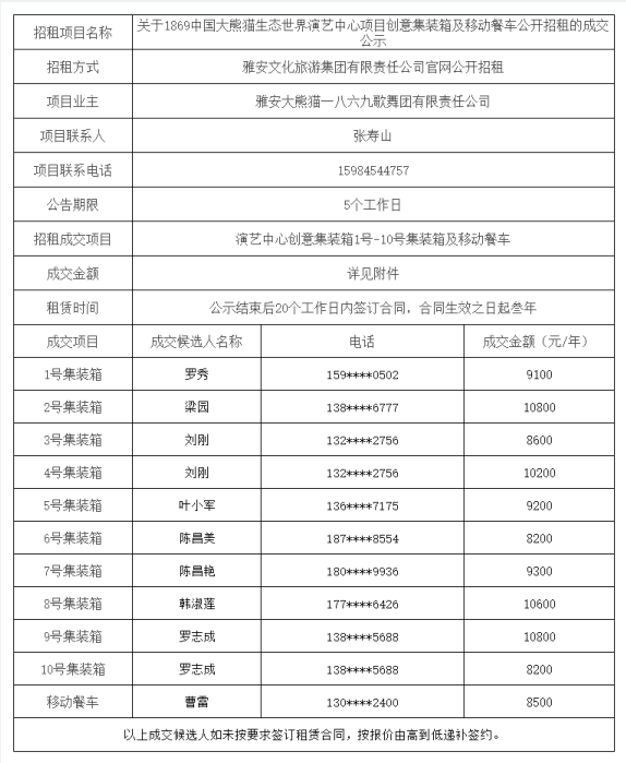 關(guān)于1869中國(guó)大熊貓生態(tài)世界演藝中心項(xiàng)目創(chuàng)意集裝箱及移動(dòng)餐車(chē)公開(kāi)招租的成交公示